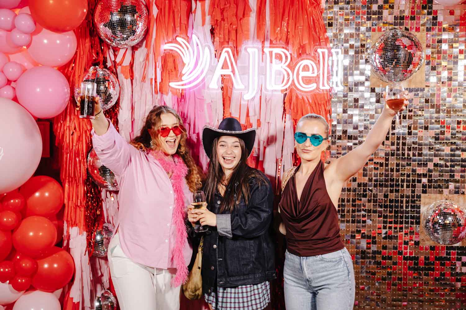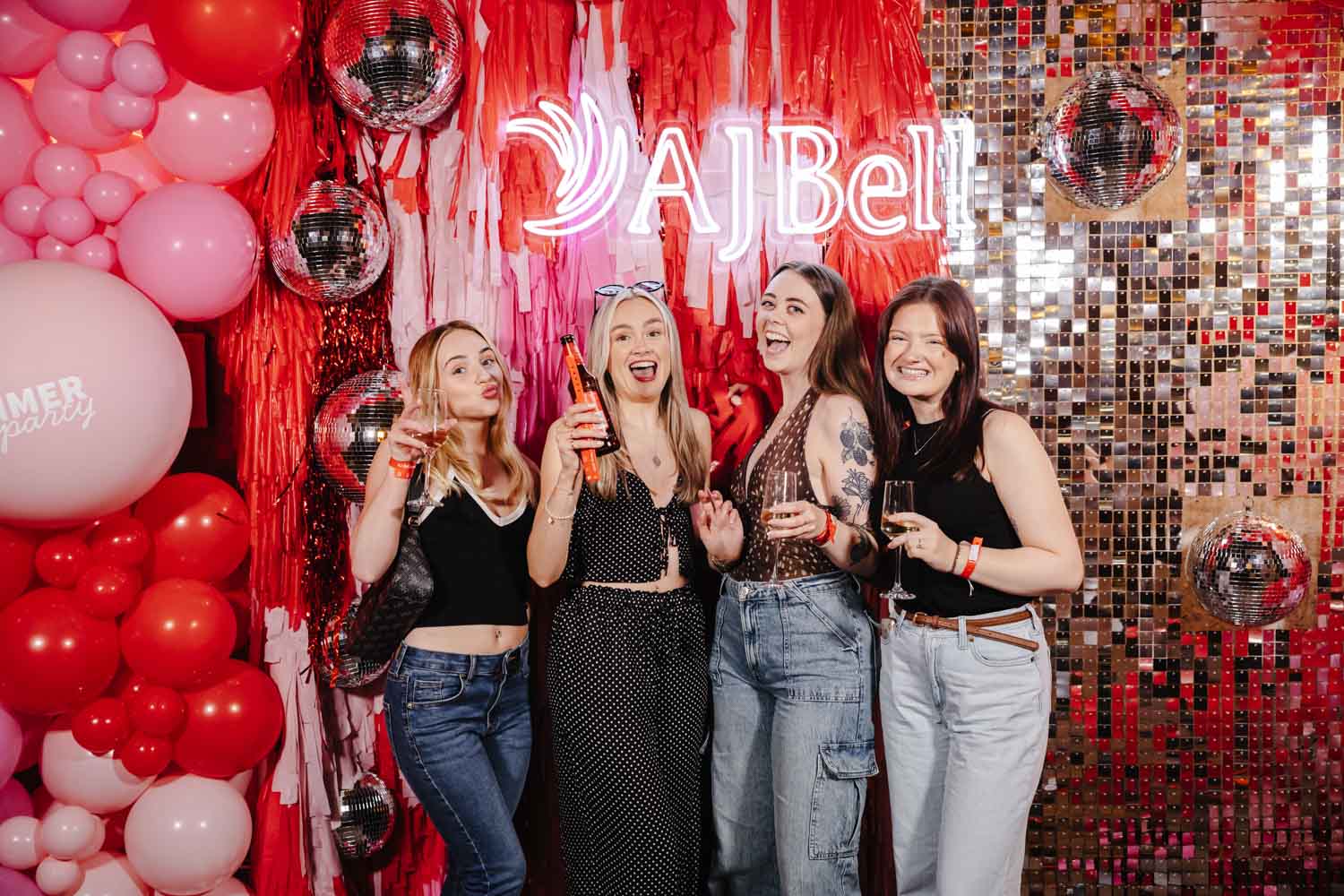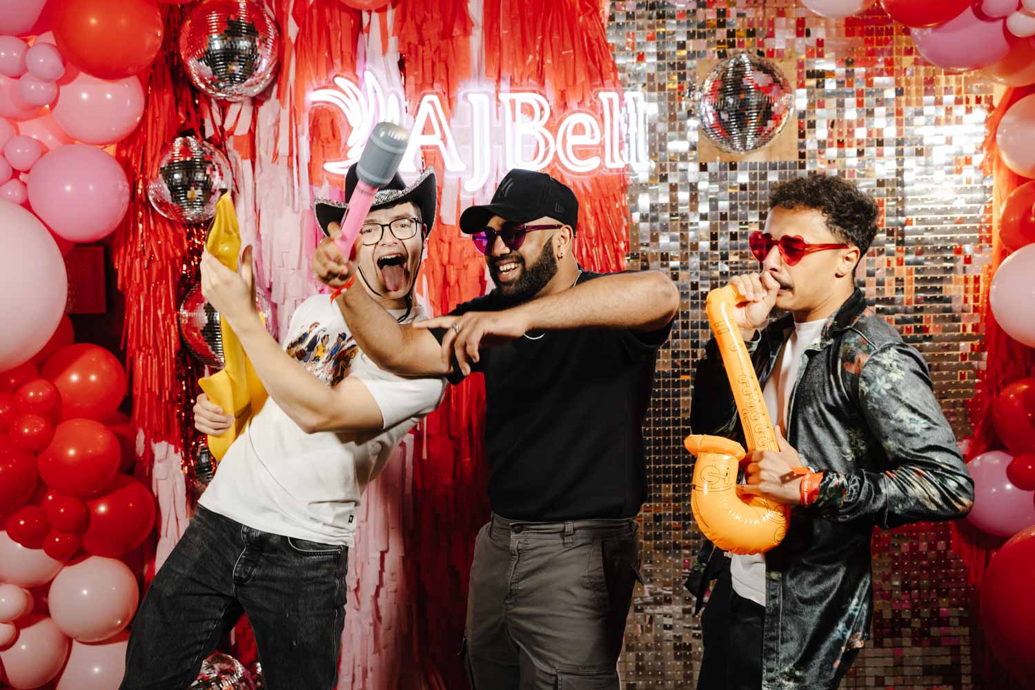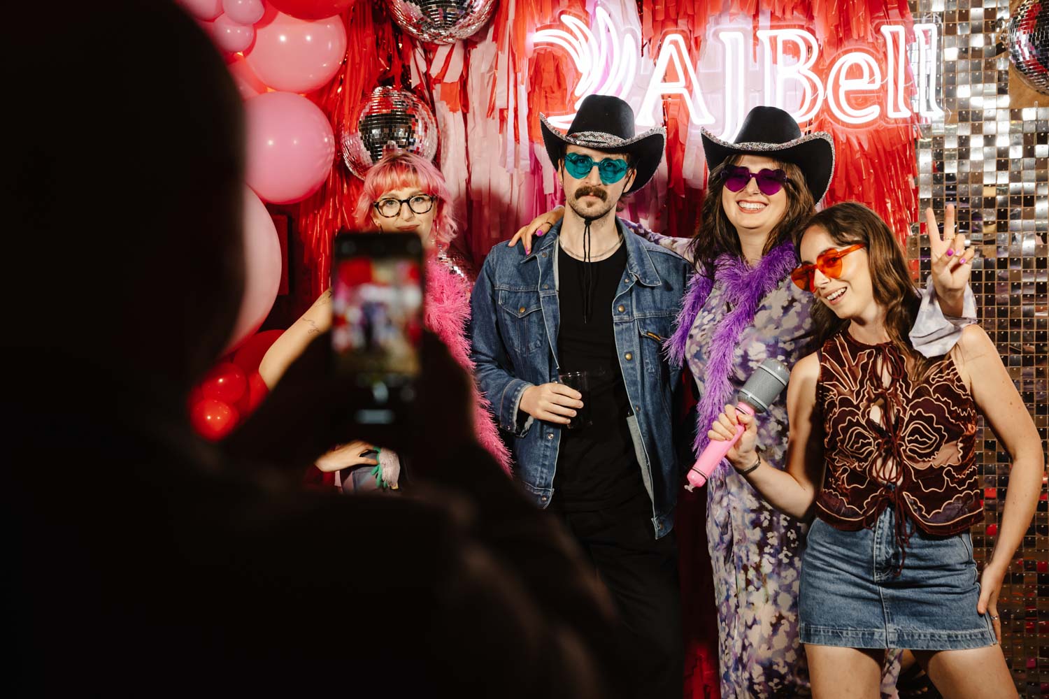 One of the highlights of the evening was the bold AJ Bell photo area. Bright balloons, disco balls, and a glowing AJ Bell sign created the perfect backdrop for fun group photos. Guests grabbed props, posed with friends, and made the most of the moment. As Event Photographers Manchester, these interactive photo spots are always fantastic to capture because they bring out genuine laughter and personality.