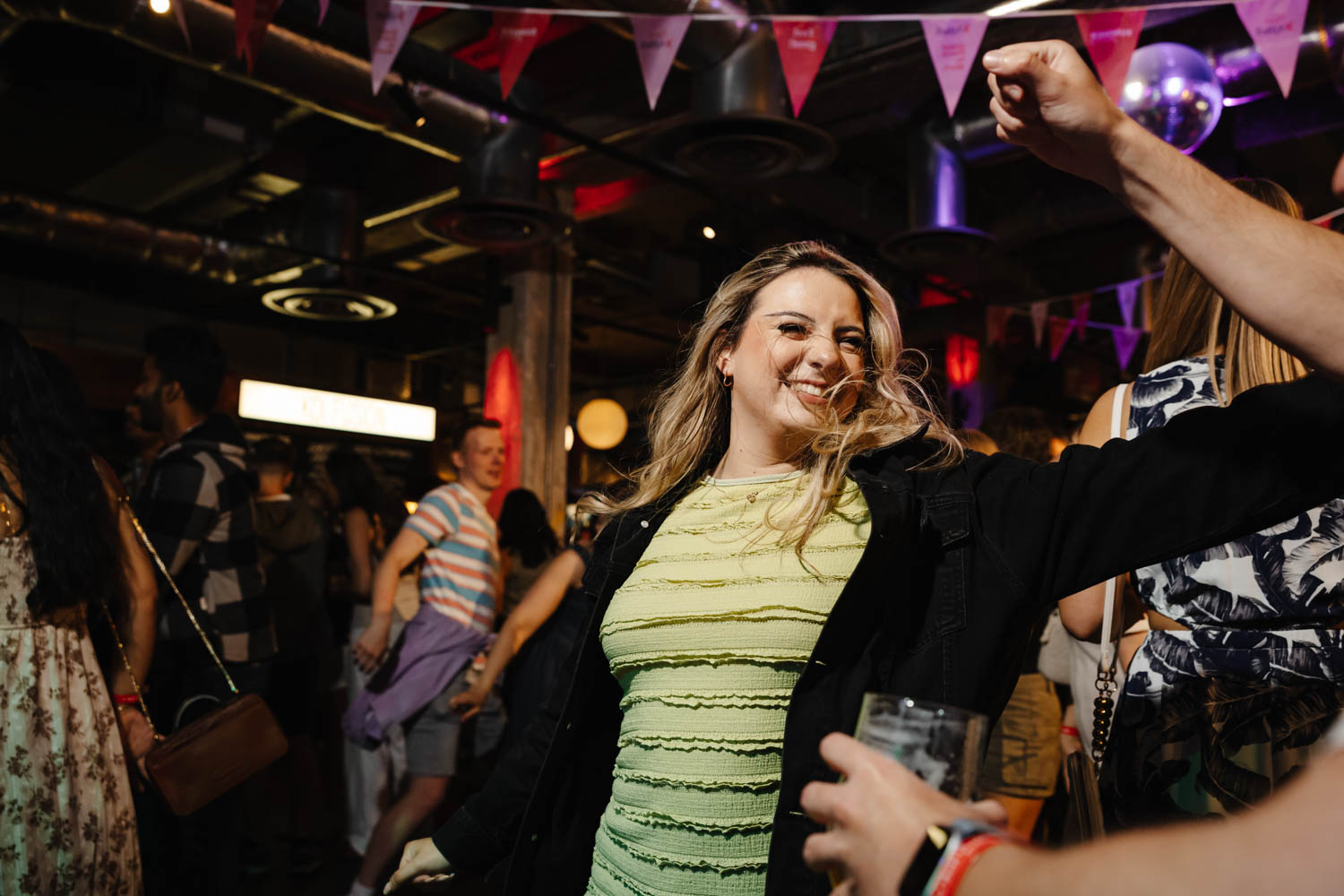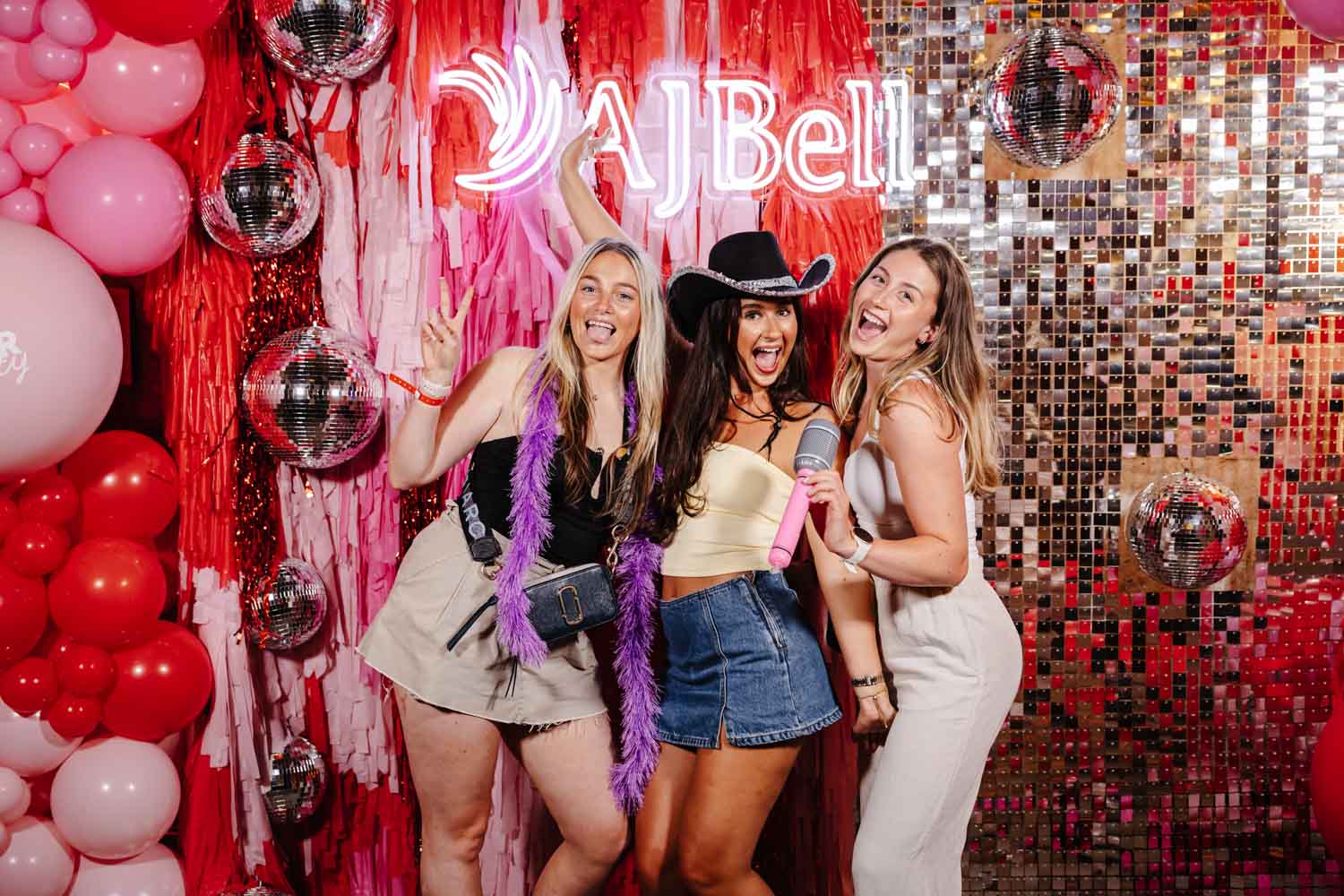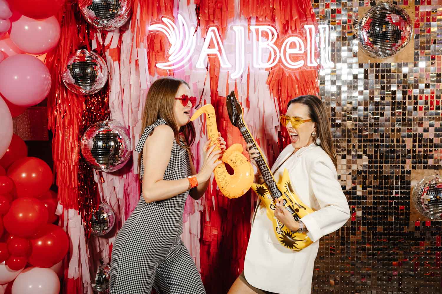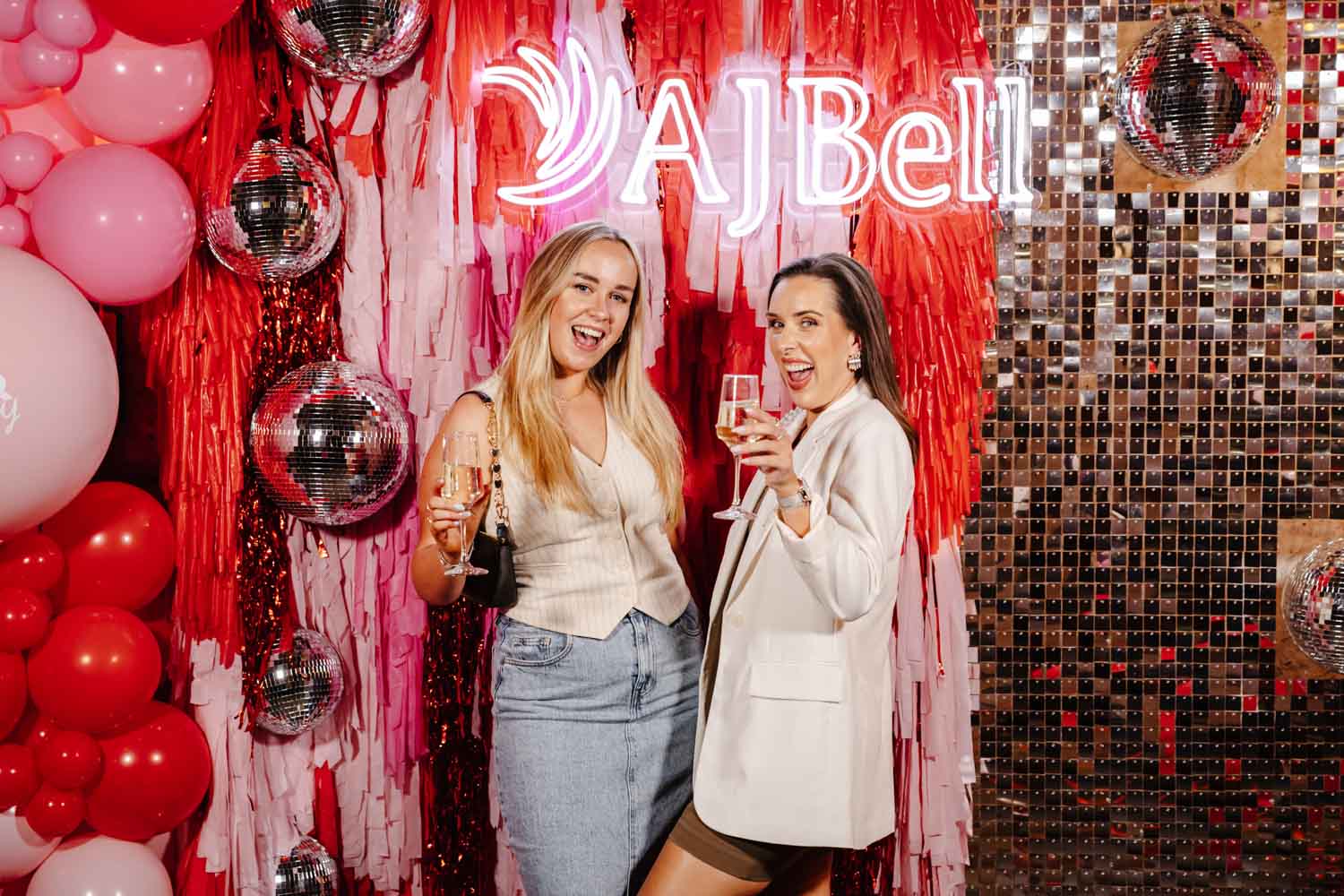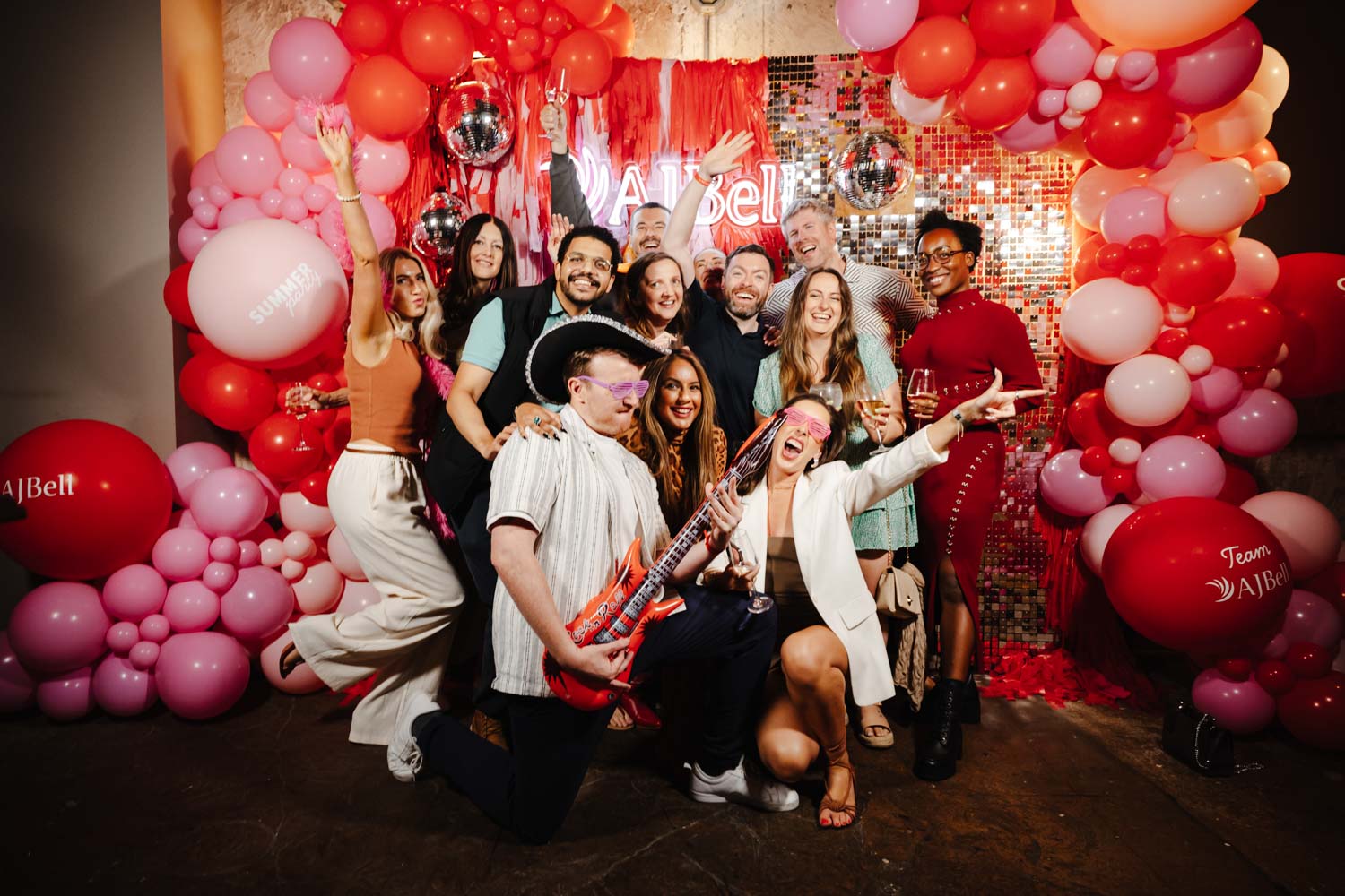 One of the highlights of the evening was the bold AJ Bell photo area. Bright balloons, disco balls, and a glowing AJ Bell sign created the perfect backdrop for fun group photos. Guests grabbed props, posed with friends, and made the most of the moment. As Event Photographers Manchester, these interactive photo spots are always fantastic to capture because they bring out genuine laughter and personality.