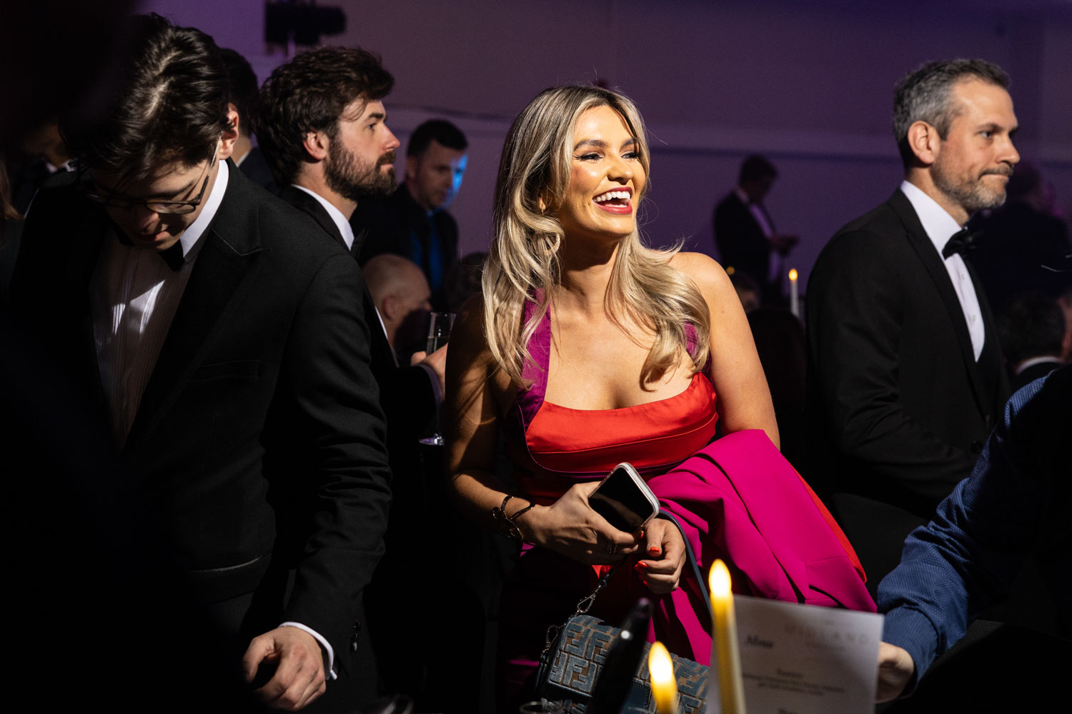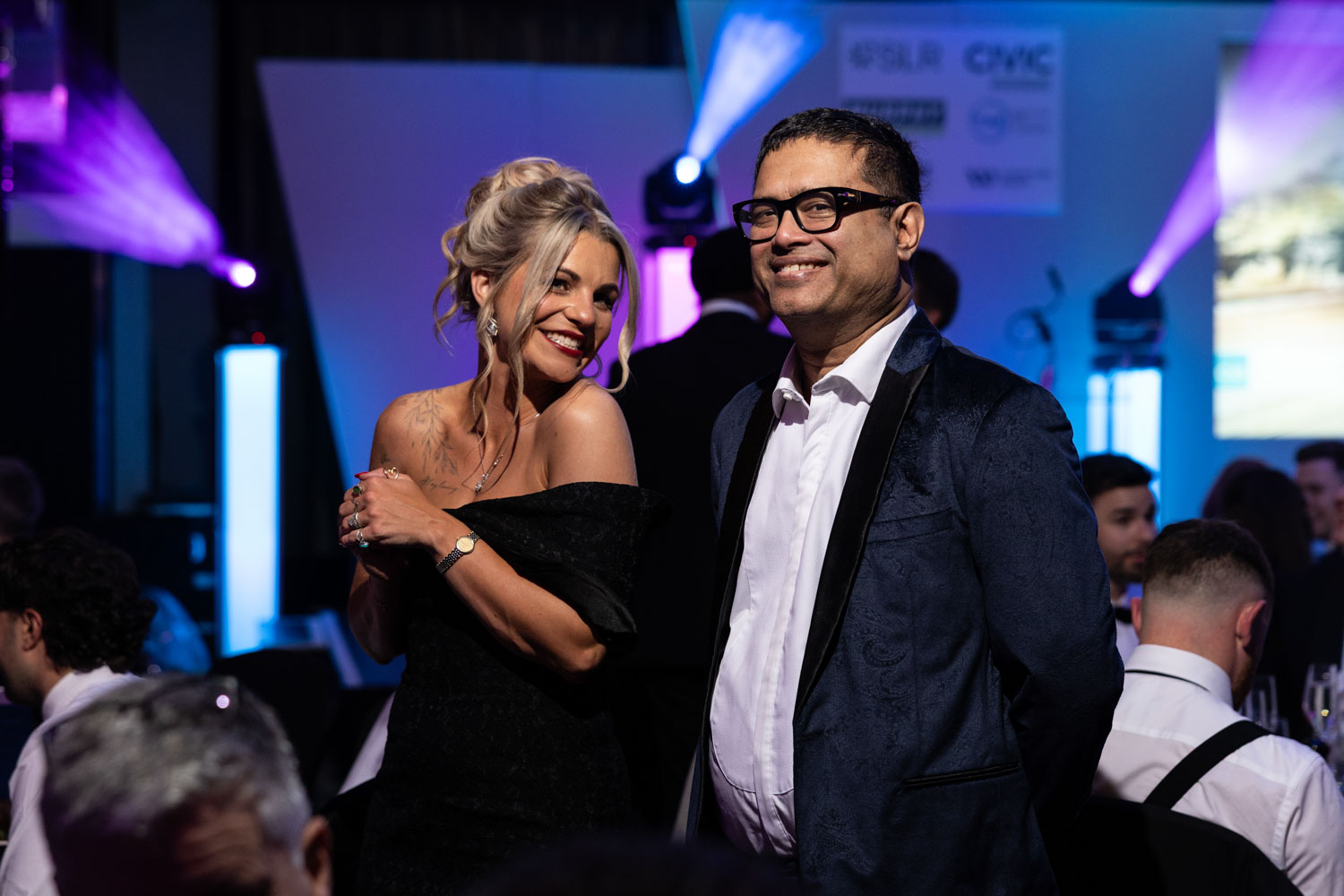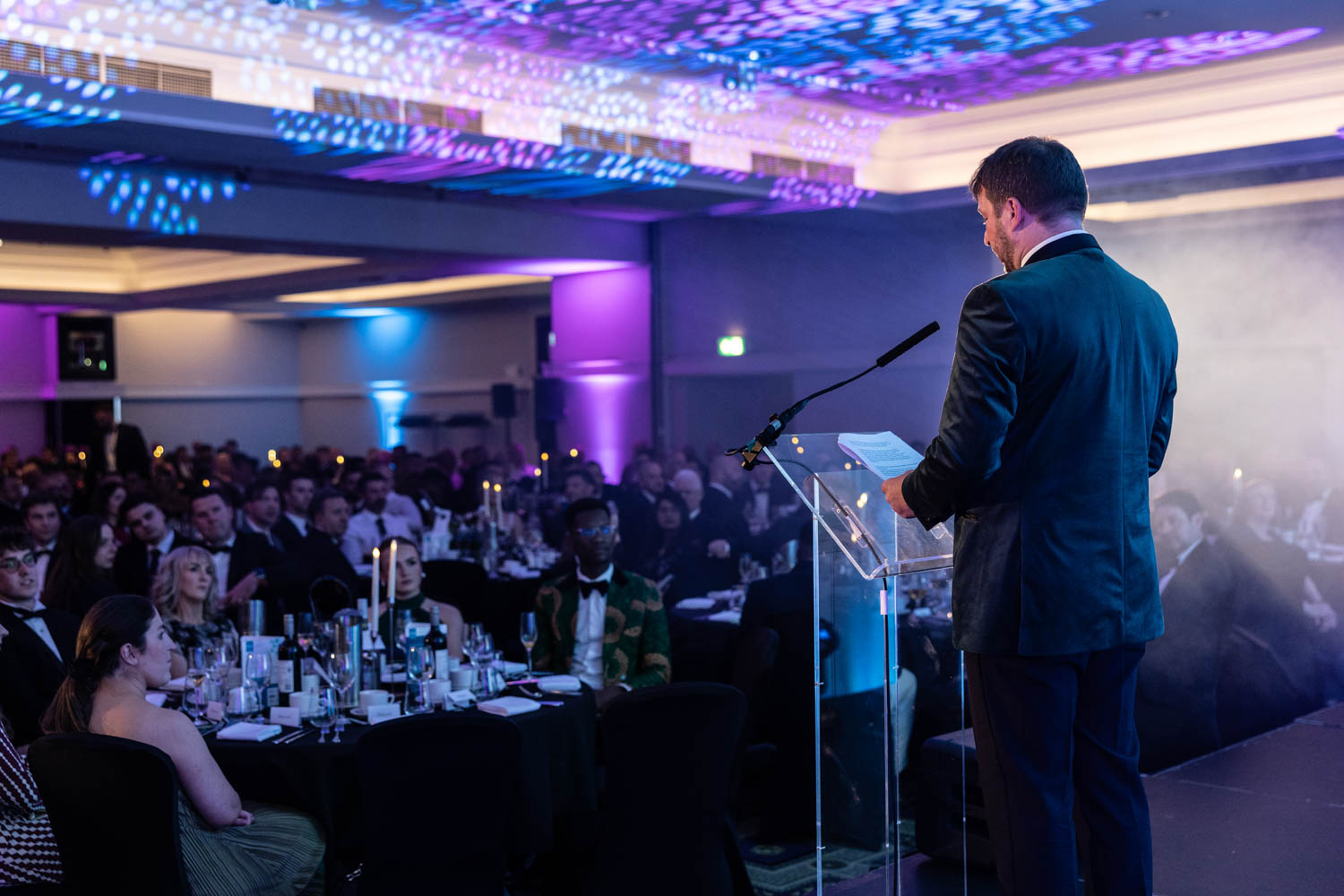 From the moment guests arrived, the room was buzzing. The stage lighting washed the room in vibrant colours while tables were dressed with candles, glassware, and carefully arranged centrepieces. As Awards Event Photographers Manchester, we focus on capturing the atmosphere as much as the action. These wide shots of the room set the scene and tell the story of the evening before the awards even begin.