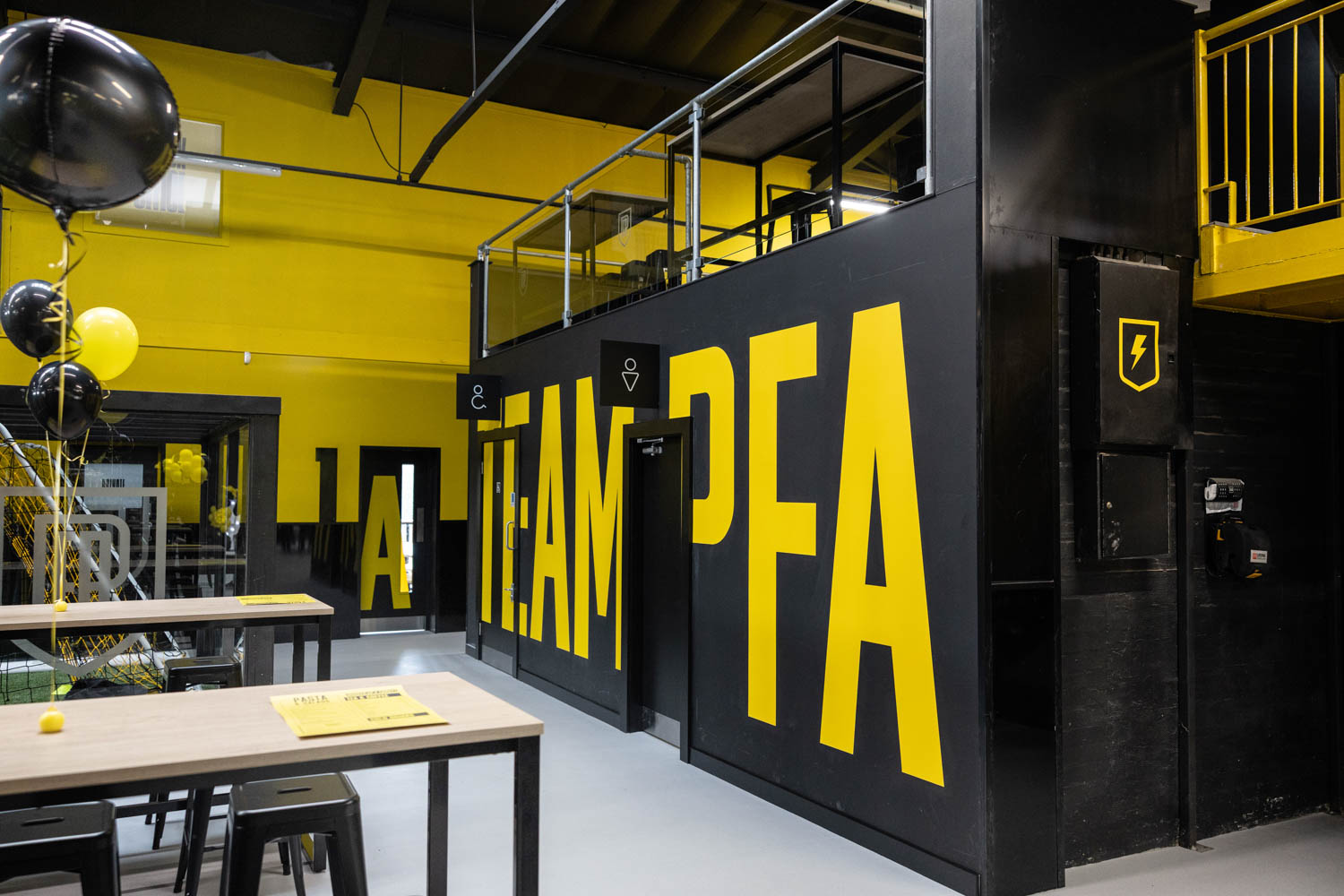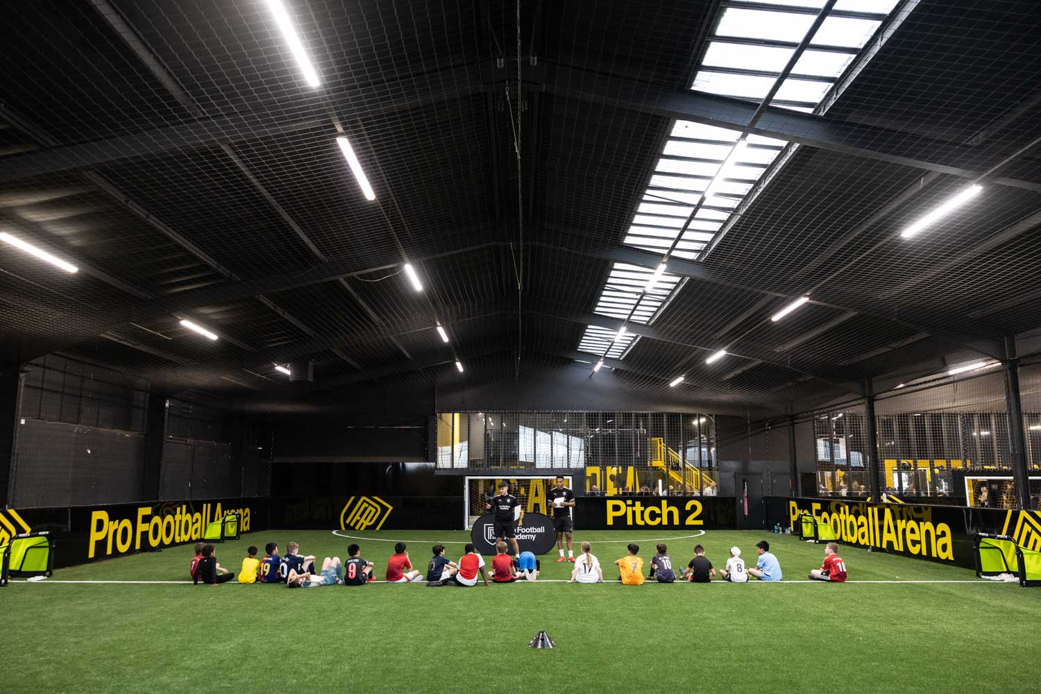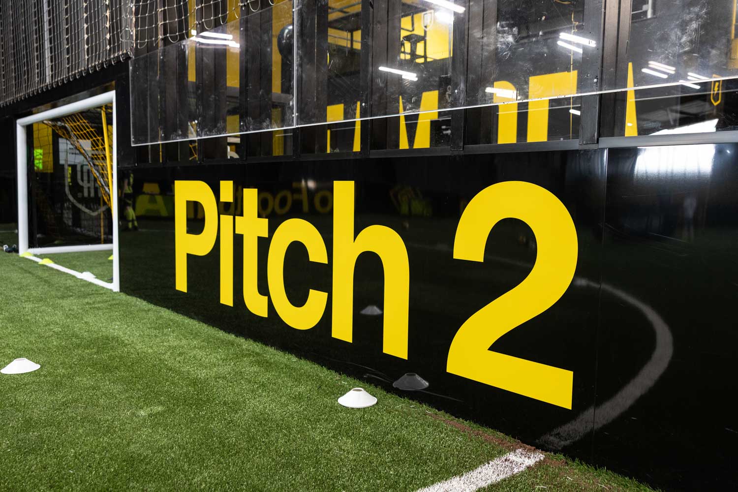 After the floods damaged the original interior, the arena underwent a complete refurbishment. The new fit out looks incredible. The indoor pitches are bright and modern, with bold black and yellow branding throughout the venue.